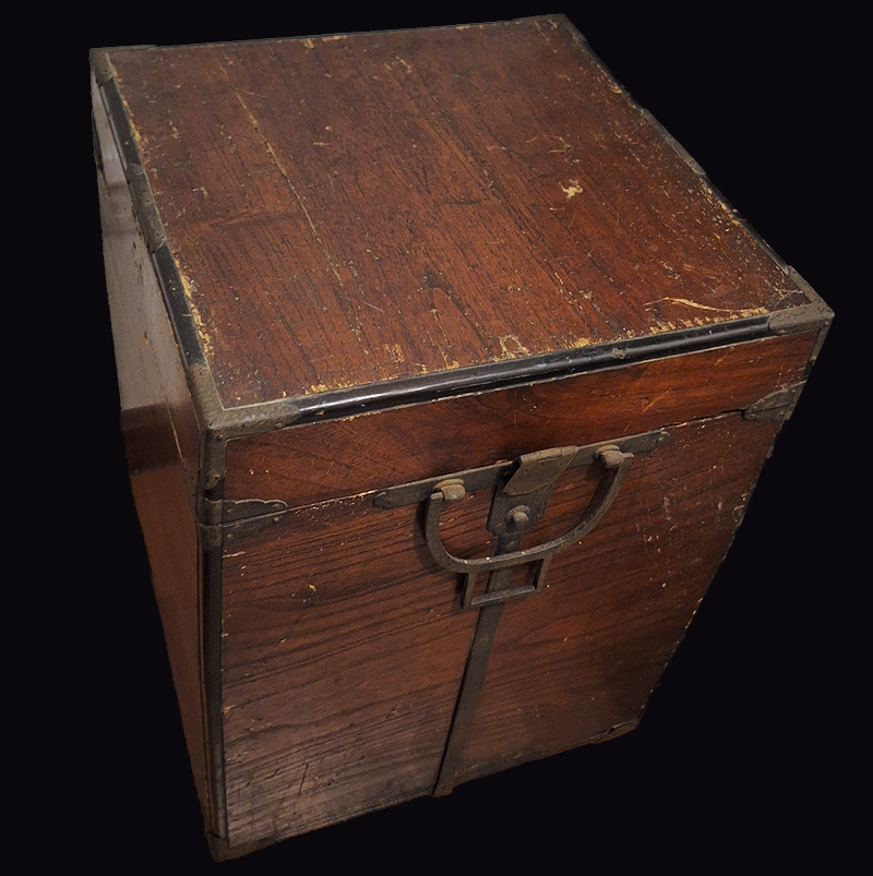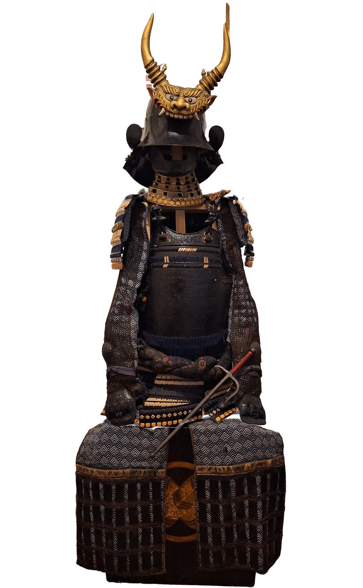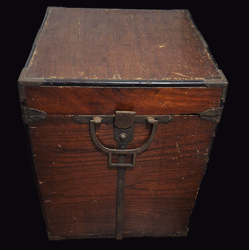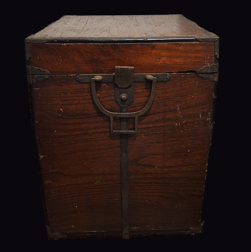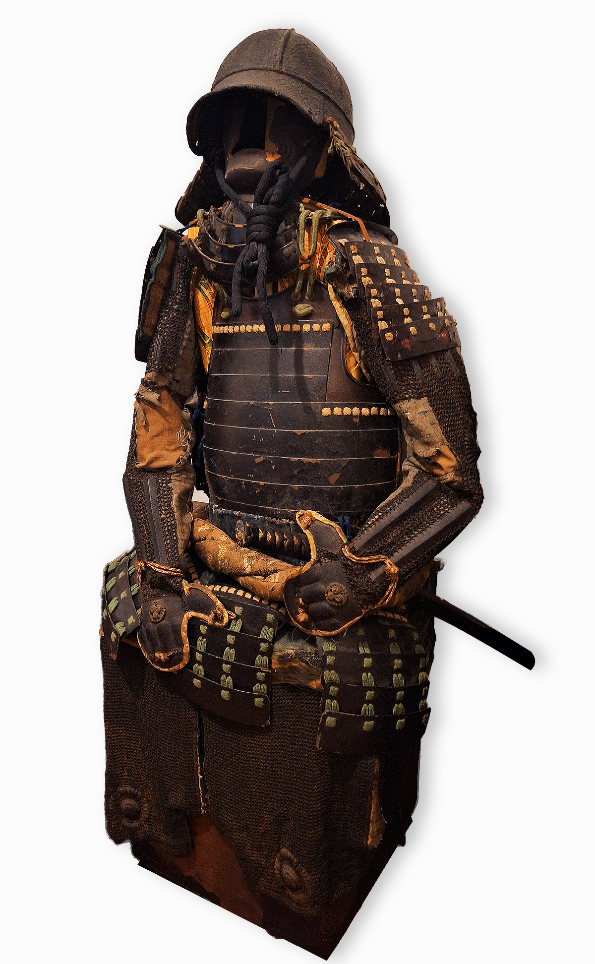 Aquí se observan un par de armaduras samurai montadas sobre sus bitsu. Una de las cajas tiene la capa de laca que recubre la madera bastante deteriorada dejando la madera al descubierto. La otra, más moderna, tiene un mon o escudo samurai superpuesto en algún otro material.