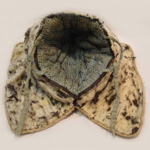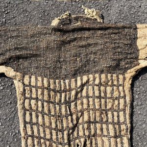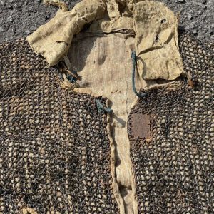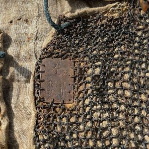 Esta armadura esta cosida en un sencillo tejido de color crema, tiene un tejido mullido por dentro en el kabuto y unos caracteres japoneses en una placa de hierro cosida en el frente de la chaqueta.