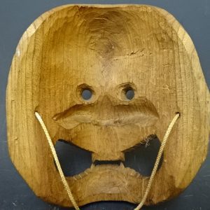 Esta máscara representa al demonio Hannya. Máscara de teatro kyogen ( una forma de comedia popular medieval la cual se origina en el área de Kyoto contemporáneamente con el Noh a principio del siglo XIV) en forma de hannya (般若), que representa a un demonio celoso. Se caracteriza por tener dos cuernos afilados, ojos metálicos y una boca lasciva.