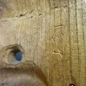 Hecho a partir de madera, presenta una firma, tal vez de quien lo realiza.