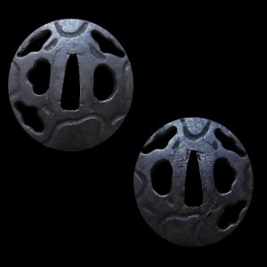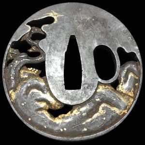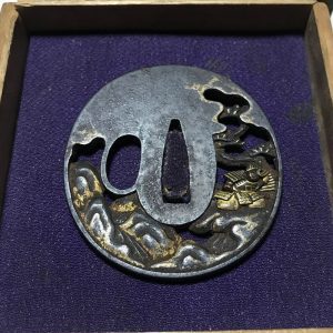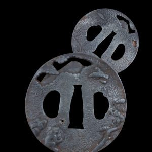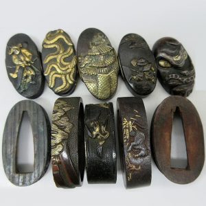 En las fotos se muesrtra una tsuba con shakudō , una aleación de cobre y oro con motivos samurai, también encontramos tsubas con firma del artesano como la horadada o es interesante ver la continuidad entre la parte de delante y la trasera en las tsubas. Se acompaña con algunas piezas de fuchiy kashira también parte de estas decoraciones en las espadas japonesas.