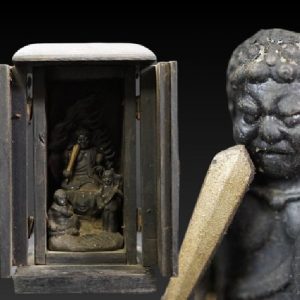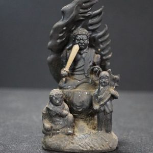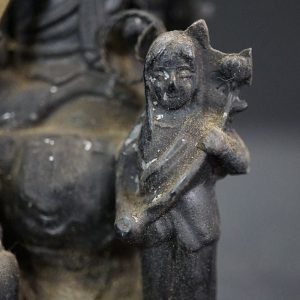Estatua en bronce de época de la tríada Fudo que preside la estatua de Fudo Myo-o (que sostiene la espada) estatua budista de 16cmx9,5 de ancho. Procedente de la región de Zushi.
